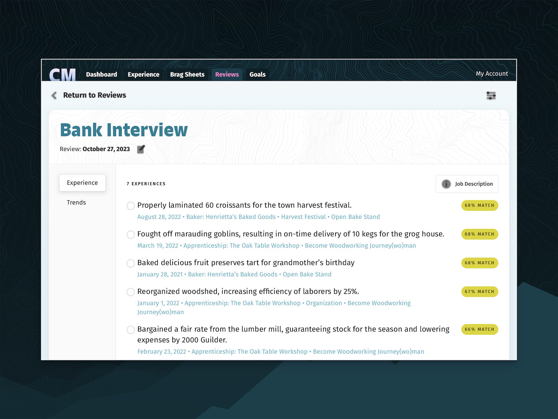 Reviews can help provide an opportunity for reflecting on whether or not your career path truly aligns with your goals. With Reviews, you can see how much of your work experience is actually related to your overall goals on a regular basis. This check-in is a great opportunity to reinforce that you’re on the right path, or help you realize you need to make a change.
