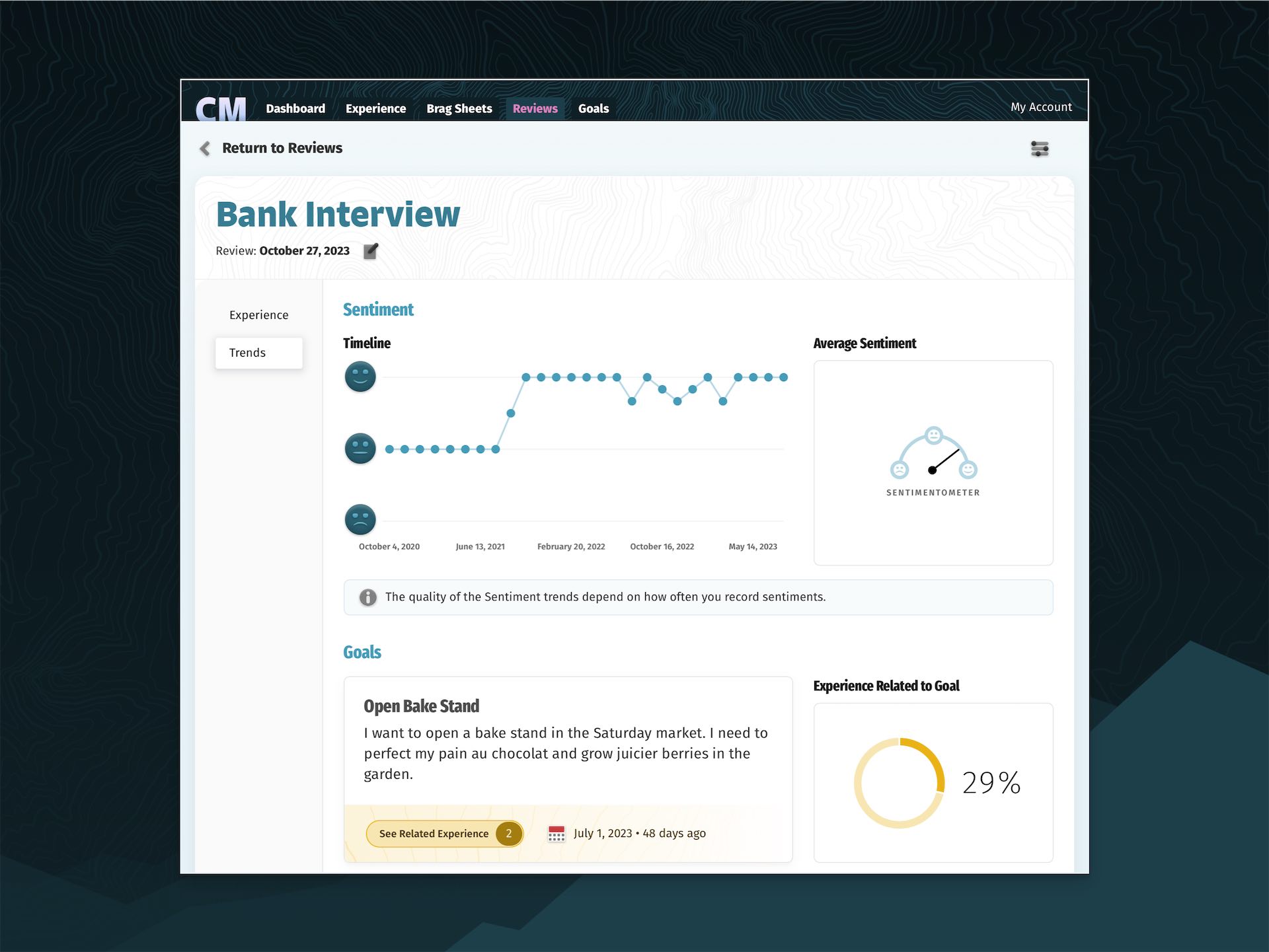Reviews are also great for job interview preparation. You can quickly review which work experience is most relevant to a job description. Your sentiments trend also helps remind you when you enjoying your career the most to have something to compare a new opportunity against.